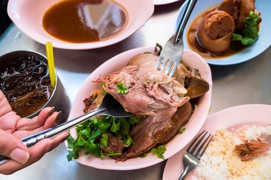 Món ăn này được nấu từ chân giò hầm, thường ăn cùng cơm, trứng luộc và rau củ. Bạn có thể gọi một đĩa Mai Ow Nang Khao Kha Moo nếu không thích thịt mỡ. Chủ quán sẽ chỉ chọn thịt nạc cho phần ăn của bạn.