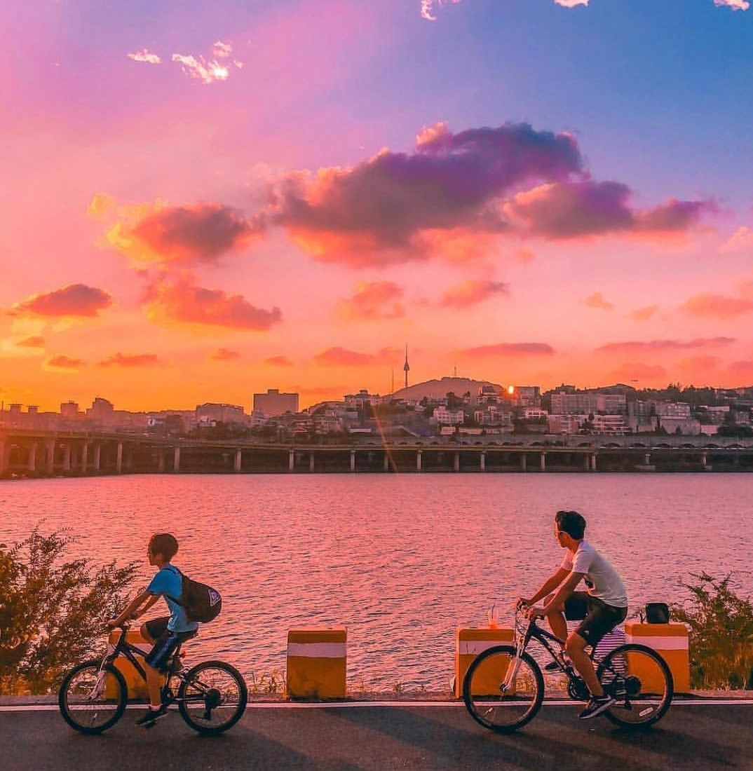 Một địa điểm tuyệt vời để thay đổi không khí và hòa mình với thiên nhiên cùng các hoạt động ngoài trời tốt cho sức khỏe tại Hàn Quốc chính là công viên sông Hàn Đây là địa điểm được giới trẻ Hàn Quốc vô cùng yêu thích. Buổi sáng, mọi người đến sông Hàn để tập thể dục và đi bộ. Sau đó, thời gian buổi trưa đến chiều sẽ thấy rất nhiều hội nhóm tổ chức cắm trại vui banh trời. Thời gian chiều tối, sẽ thấy nhiều người đạp xe đạp dạo quanh sông Hàn, mọi người cùng nhau ngắm hoàng hôn trên sông, bạn bè mua gà mua bia nhâm nhi và trò chuyện rôm rả cho đến tận tối muộn. Hãy thử trải nghiệm ngồi ở sông Hàn ăn gà và uống bia nhé.