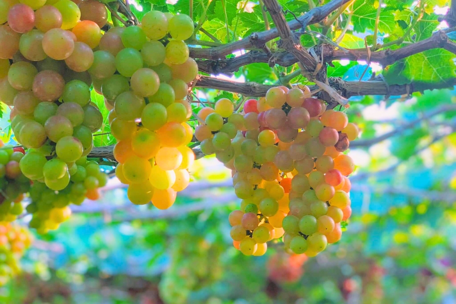 Ninh Thuận là một tỉnh có tiết trời nóng quanh năm, nhưng lại phù hợp với loài cây trồng như nho và táo. Hai giống nho chính ở Ninh Thuận là nho đỏ và xanh. Ngoài ra người dân ở đây còn trồng nho đen để dùng làm rượu vang. Trên các cung đường của Ninh Thuận, bạn sẽ thấy bạt ngàn những vườn nho và táo. Đến đây, bạn không chỉ được ngắm nhìn những vườn nho trĩu quả mà còn được ăn nho căng bụng và mua về làm quà cho gia đình.