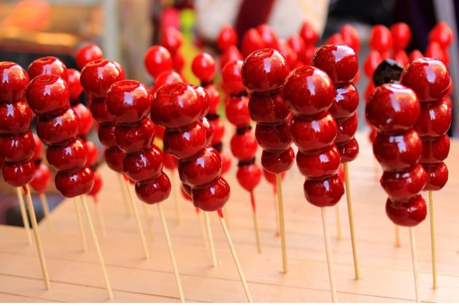 Nếu bạn hay xem phim cổ trang Trung Quốc sẽ thấy các nhân vật trong phim hay ăn 1 xâu kẹo màu đỏ. Đây là món ăn vặt nổi tiếng mê hoặc mọi du khách Đài Loan. Kẹo hồ lô được làm từ dâu tây hoặc cà chua bi bên ngoài phủ một lớp đường. Giá 1 xâu kẹo hồ lô chỉ 50 tệ.