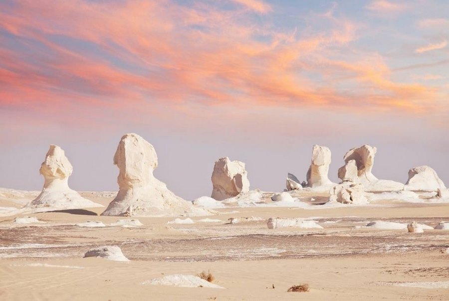 ● Sa mạc Trắng: Sau khi rời khỏi sa mạc Đen, quý khách sẽ tiếp tục tham quan một sa mạc với chỉ duy nhất màu trắng đơn sắc mênh mông. Quý khách sẽ có cơ hội được nhìn thấy rất nhiều những măng đá lấp lánh như pha lê – thứ mà tưởng chừng chỉ ở trong hang động mới có nay lại tồn tại ngay mảnh đất khắc nghiệt khô cằn sa mạc. Bên cạnh đó cả một khoảng rộng lớn ở đây đều có rất nhiều những cột đá hình cái nấm – thứ sẽ làm quý khách liên tưởng đến kỳ quan Cappadocia của Thổ Nhĩ Kỳ. Chính vì thế, khu vực này còn được coi là bảo tàng nghệ thuật đương đại ngoài trời.
