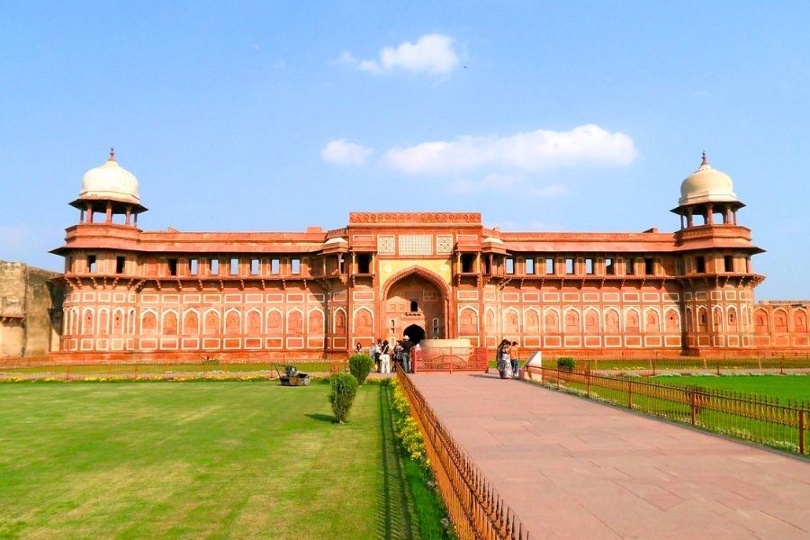 Pháo đài Agra được xây dựng bằng đá sa thạch đỏ từ thế kỉ 16. Quần thể pháo đài rộng lớn có diện tích lên đến 103 ha. Các đền thờ, điện hoàn chỉnh, những bồn hoa rực rỡ, từng chi tiết được chạm khắc tinh xảo đã làm nên pháo đài đỏ mỹ lệ..