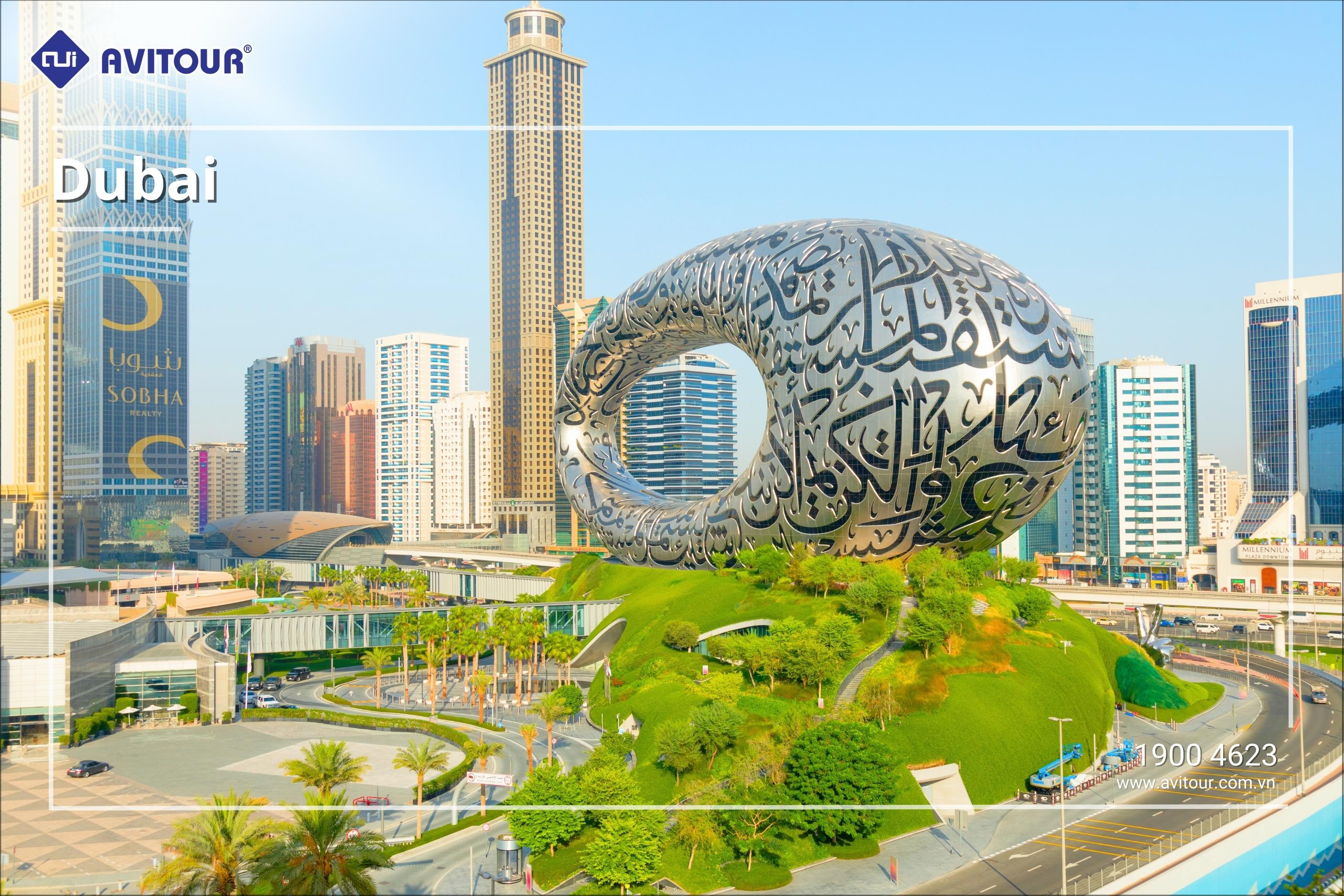 08h00: Xe đưa đoàn đến Museum of the future (Bảo Tàng Tương Lai) - Biểu tượng mới của Dubai và được coi là tòa nhà “Đẹp nhất hành tinh” (tham quan bên ngoài) và chụp hình.