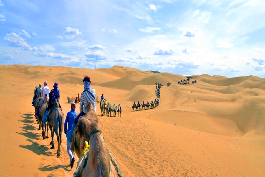 Hãy tận hưởng giây phút vui vẻ và thư giãn trên lưng lạc đà. Đừng quên vừa lang thang vừa ngắm nhìn những đụn cát sa mạc thay đổi màu sắc. Hoặc tưởng tượng trở thành anh hùng trong một bộ phim cổ trang hào hùng của Trung Quốc.