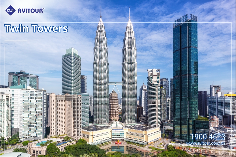 Chiều: Đoàn chụp hình lưu niệm tại Tòa Tháp Đôi (Twin Towers) – là biểu tượng và là niềm kiêu hãnh của nhân dân Malaysia ngay từ khi nó xuất hiện, do tập đoàn dầu khí mạnh nhất Malaysia xây dựng. Tòa tháp cao 451,9m so với mặt phố, biểu tượng nổi tiếng này có cấu trúc sinh đôi cao nhất thế giới và là toà nhà chọc trời cao thứ năm. Cây cầu trên trời nối liền hai tòa tháp cũng là cây cầu hai tầng cao nhất thế giới. tòa nhà 88 tầng có kính và thép ở bên ngoài, và nội thất, lấy cảm hứng từ truyền thống, phản ánh khát vọng của Malaysia trong việc tiến lên và vẫn mang bản sắc dân tộc. Sau đó quý khách tự do tham quan, mua sắm tại các siêu thị cao cấp trong chân tháp.