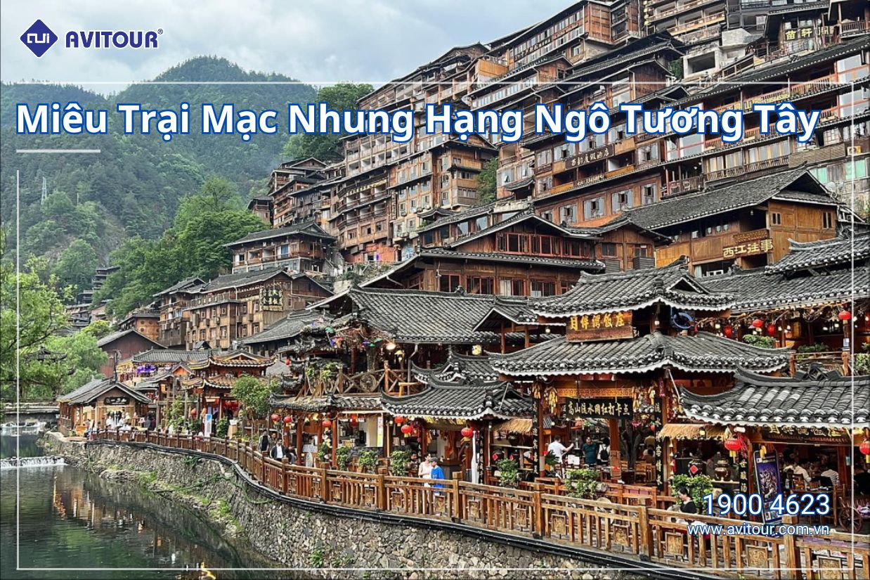 - Trên đường về, Quý khách ghé thăm “Miêu Trại Mạc Nhung Hạng Ngô Tương Tây” - Một trong những ngôi làng cổ tuyệt đẹp với những bậc thang độc đáo. Bạn sẽ được hòa mình vào nhịp sống êm ả của người Miêu nơi đây với những hoạt động hấp dẫn, tham gia các lễ hội đặc trưng như tiệc Trường Long của trại tộc Miêu, chặn cửa mời rượu, hát hò, nhảy múa trò chuyện.