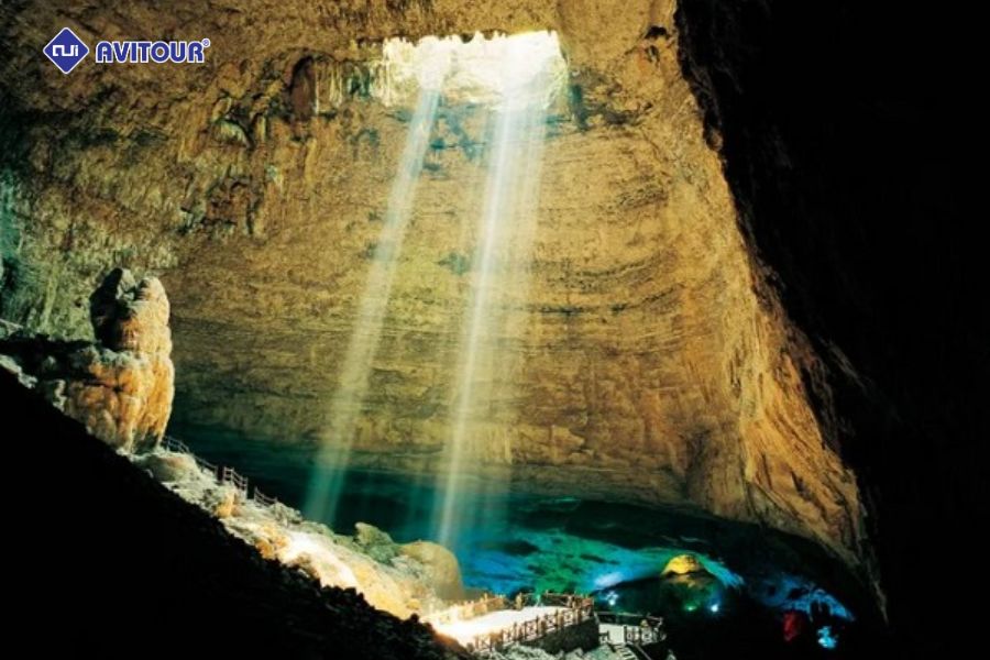 Men theo dòng nước chảy, bạn sẽ mãn nhãn trước hình ảnh hiện ra trước mắt. Với những tia sáng từ giếng trời chiếu xuống, luồn lách qua từng khe đá trên đỉnh. Tạo thành hàng nghìn viên ngọc sáng lung linh. Rồi từ từ tương phản với dòng suối trong vắt phía dưới vô cùng cuốn hút.
