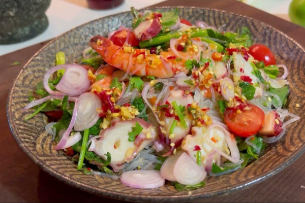 Đừng bỏ qua món salad miến tôm này nhé – món ăn ngon vô cùng hấp dẫn và phù hợp khẩu vị nhiều người. Món ăn này với thành phần chính bao gồm: hành tây, chanh, tôm khô, đậu phộng, cần tây Trung Quốc, tỏi và thịt heo đem nấu cùng với ớt. Khi ăn, đem trộn chung tất cả các nguyên liệu lại với nhau để tạo hành món salad vô cùng thơm ngon và hấp dẫn.