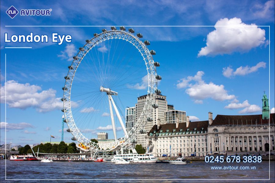 - London Eye siêu hiện đại. Đó là bánh xe khổng lồ quay từ từ, nằm sát bờ sông Thames.