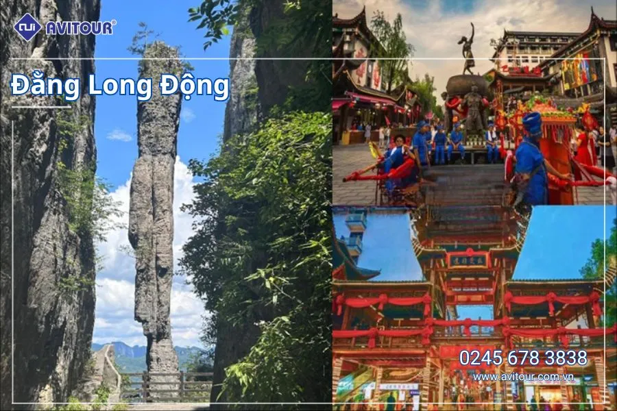 - Đằng Long Động - Hang động có tổng diện tích hơn 2 triệu mét vuông, có núi, có nước, có hang, có rừng. Nơi đây nổi tiếng trong và ngoài nước nhờ sự hùng vĩ, nguy hiểm, kỳ lạ, tĩnh mịch và tuyệt đẹp. Trong hang có 5 đỉnh núi, 10 sảnh, hơn 10 thác nước ngầm, có núi trong hang và cũng có hang trong núi, có sự thông nhau giữa hang nước và hang cạn, hang chính và hang phụ. Nhiệt độ trong hang luôn ổn định quanh năm, từ 14°C đến 18°C. Cảnh quan trong hang đa dạng và huyền bí. Phía ngoài non nước hữu tình, thác nước có độ cao hơn 20 mét, tiếng thác chảy gầm gào như tiếng sấm, vô cùng tráng lệ. Quý khách có thể trải nghiệm ngồi Khinh khí cầu (Tự túc chi phí) để ngắm nhìn toàn cảnh của hang động Đằng Long.