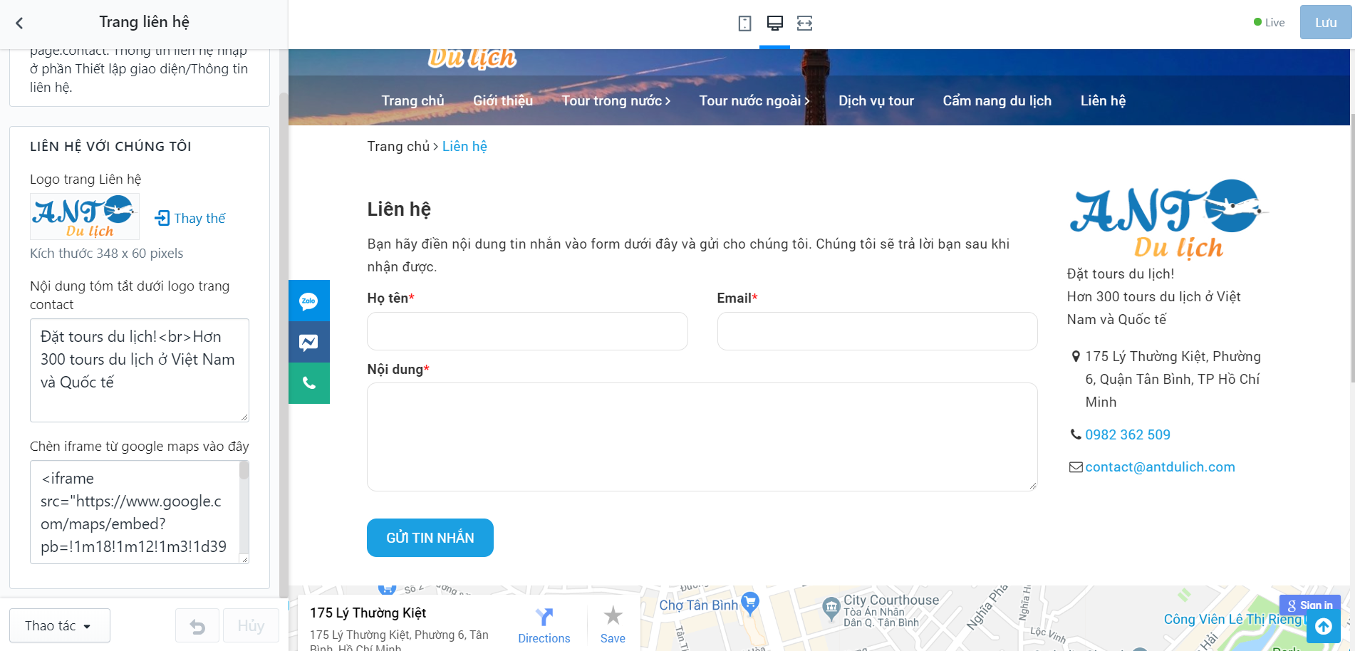Tại đây bạn có thể thay đổi Bản đồ cũng như các thông tin liên hệ:
