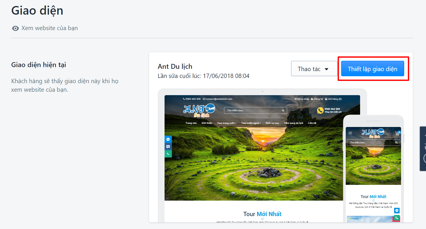 Sau khi cài đặt theme mới lên cửa hàng, bạn bấm vào THIẾT LẬP GIAO DIỆN để tùy chỉnh theme: