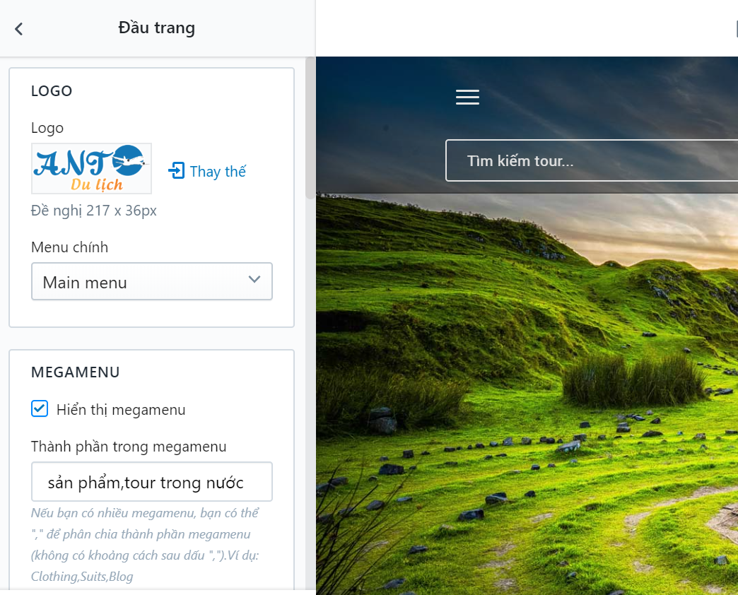 Tại đây cho phép bạn thay đổi tất cả các logo, Menu, Danh mục sản phẩm: