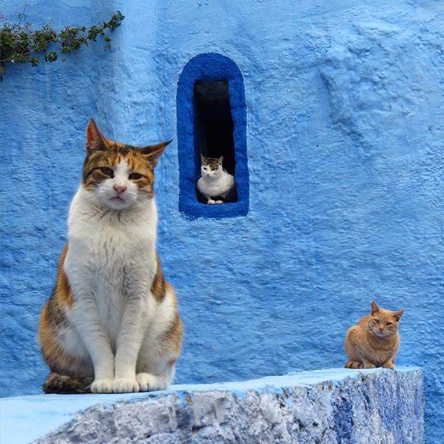 Không chỉ nổi tiếng với màu xanh lộng lẫy và rực rỡ, Chefchaouen còn có một “đặc sản” khác là mèo. Mèo được nuôi rất nhiều ở đây nhưng chúng rất hiền lành, thân thiện và đáng yêu. Đến đây, bạn sẽ gặp chúng ở khắp mọi nơi, trên các bậc thềm cửa, trên các bậc thang hay các con dốc thoai thoải. Thỉnh thoảng, bạn còn thấy cả gia đình nhà mèo nằm phơi nắng dọc bên đường.